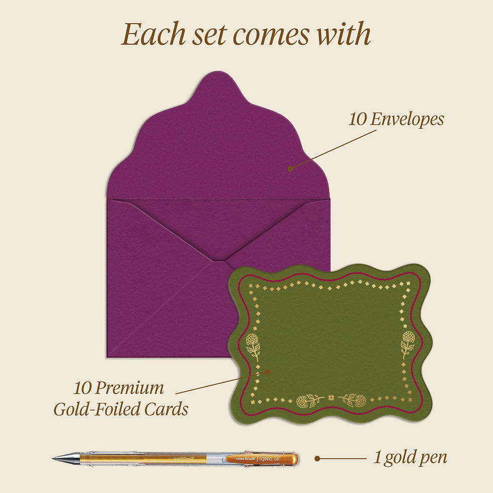 Inspired by the timelessness of a rose, the Gulab Notecard Set blends vintage charm with a modern touch. Each set includes 10 gold-foiled notecards and matching envelopes, perfect for festive notes and heartfelt messages. Paired with a sleek gold pen, this set adds a touch of elegance to any occasion.